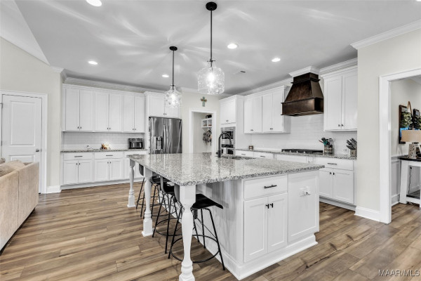 A long, elegant foyer welcomes you into the dining area — a versatile space perfect for family meals or entertaining guests. Just beyond, a cook’s dream kitchen awaits, featuring gleaming granite countertops, a massive center island, and plenty of room for meal prep and gathering.