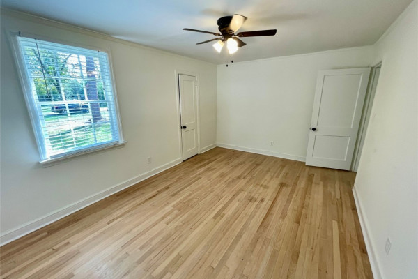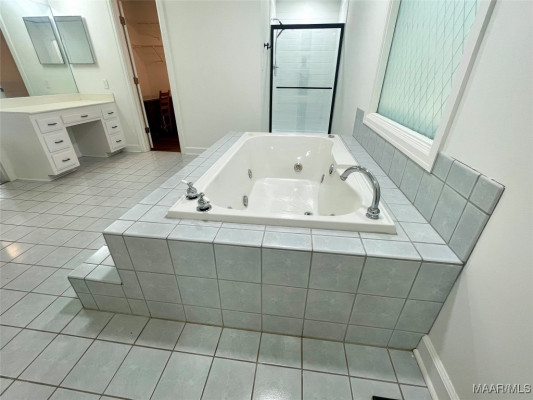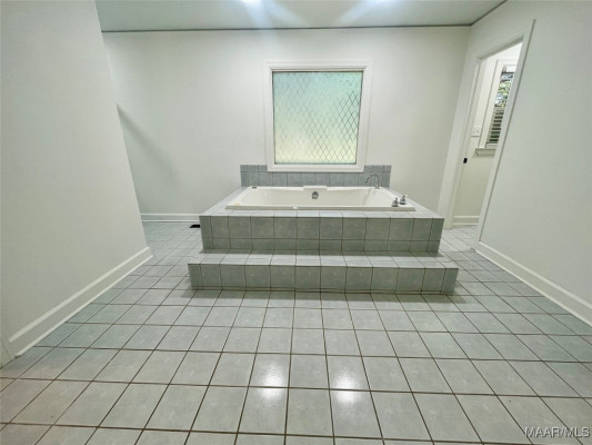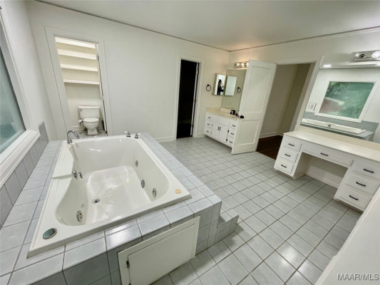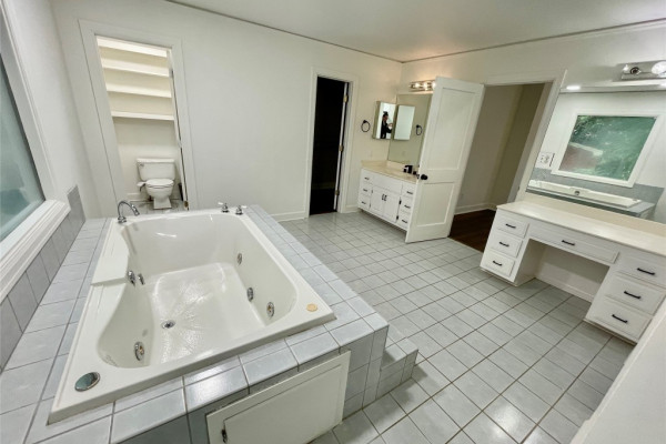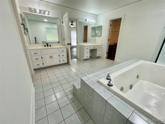 The spacious master suite features a partially remodeled bathroom with a newly tiled shower, jetted tub, split vanities, a private water closet, and two walk-in closets. Two additional bedrooms offer generous closet space, with one featuring a private half bath. The hall bathroom has also been fully renovated.