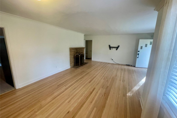The living and dining room combination showcases refinished hardwood floors and a cozy wood-burning fireplace with a sandstone surround. The den includes a gas-log fireplace and abundant closet space—it could easily function as a fourth bedroom, complete with private exterior access for added flexibility.