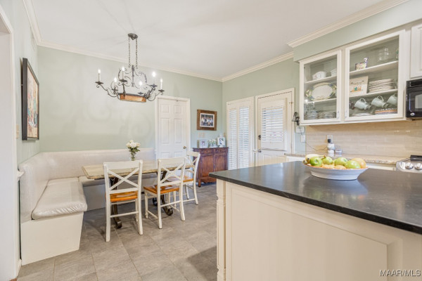 The eat-in kitchen is designed for both functionality and comfort, featuring a banquette with storage hidden in the seats. Updated cabinetry with drawers and attractive granite countertops make this space both practical and visually appealing.