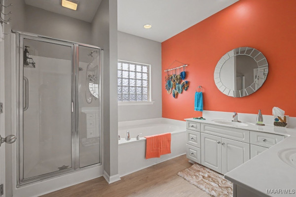 Welcome to this charming three-bedroom garden home offering approximately 1,932 square feet of comfortable living space, situated on a spacious corner lot. Bright, inviting living areas create a warm and welcoming atmosphere, highlighted by a wood-burning fireplace. The extra-large primary suite features two vanity sinks, a private en-suite bath, and an impressive custom walk-in closet. The home also offers a large eat-in kitchen with ceramic tile flooring, a pantry, and an island—ideal for both everyday living and entertaining. Two additional bedrooms share a well-appointed full bathroom. An easily accessible walk-up attic provides excellent potential for future expansion with full renovation. Recent updates and upgrades include waterproof luxury vinyl plank flooring throughout the home (excluding the kitchen), a new hot water heater, upgraded ceiling fans throughout including the patio, added electrical outlets and electrical improvements, a state-of-the-art HVAC system installed in 2022, fresh interior paint completed in 2023, a fenced yard with a new wide gate, and a roof replacement completed in 2024.