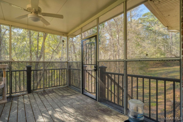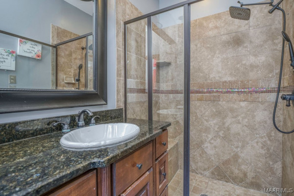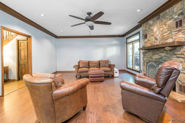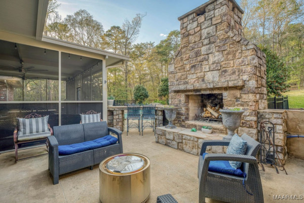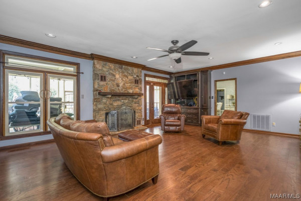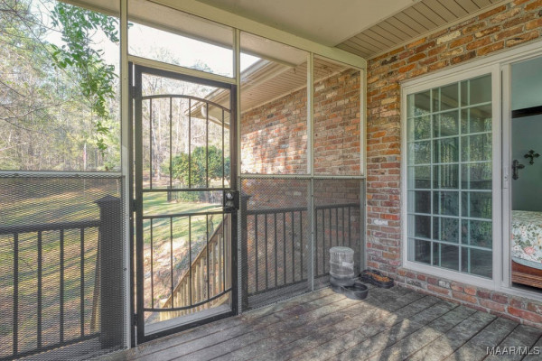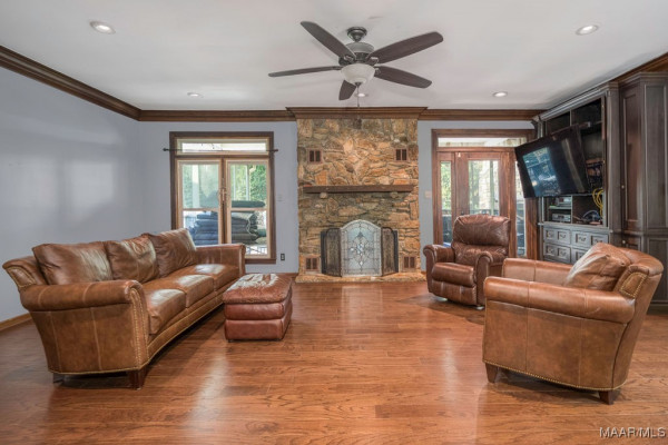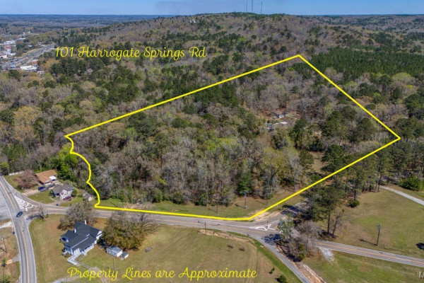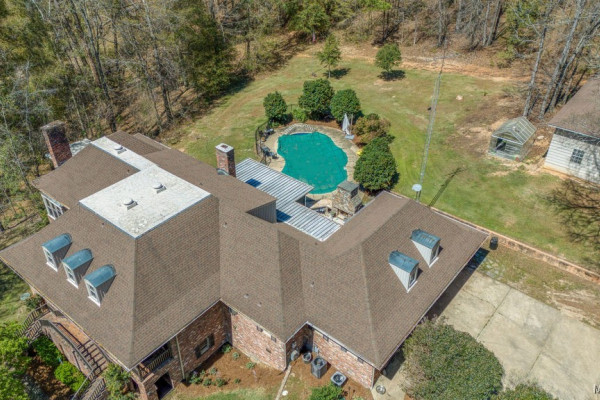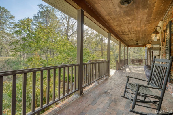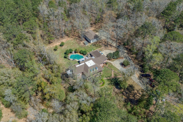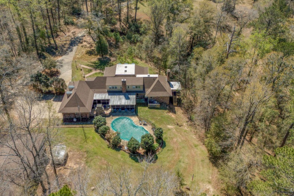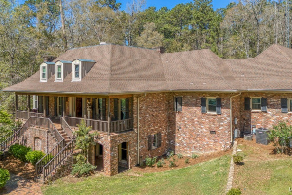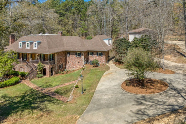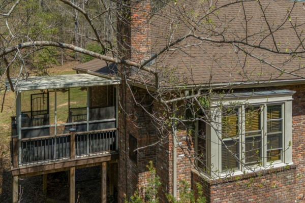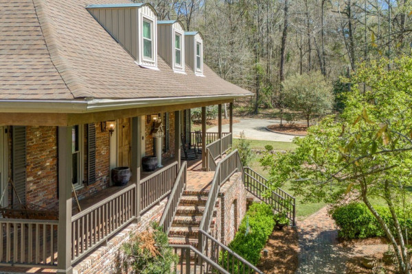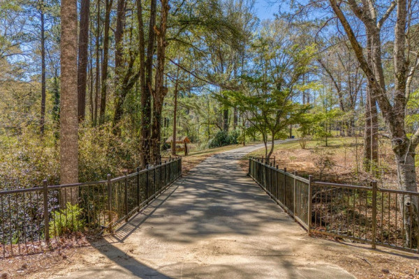 With approximately 13 acres this stunning home with a Guest Apartment is in a class by itself! The driveway borders an open meadow and crosses Harrogate Springs Creek on a bridge with security gate and is supported by the frame of a railroad boxcar. Enjoy the sound of the creek that loops through the property from the front porch, the main bedroom side screened porch, the screened back porch or by the pool and fountain. This 3-level home is built on a slope so Level 2 is the heart the main living areas. The front has 2 sets of curved brick steps rising to the 46 foot wide brick floored front porch on Level 2. The wide entry foyer leads to the library-formal living room with a wall of bookcases and shelves on the left, the formal dining room on the right and straight into the great room with a grand fireplace. On the kitchen wing of level 2 is an extra large pantry with built-in cabinets and icemaker, a spacious laundry that has a commercial refrigerator-freezer, a half bath and a breakfast room with a bay window viewing the patio fireplace. The kitchen has 2 separate sinks, double ovens, pull-out can and spice racks and cabinets galore. On the bedroom wing of level two is a hallway of storage closets, a guest room with an outside entrance and full bath, the main bedroom suite with a fireplace, a side screened porch, and a bath with a garden tub, separate shower, private water closet, and walk-in closet. Level 3 has an office with stairs to garage, 4 bedrooms and 2 Jack ‘n Jill bathrooms. All the bedrooms have walk-in closets, and 2 of the closets open to additional floored attic storage with spray foam insulation. Level 1 Guest Apartment has a private entrance from the brick patio under the front porch. There’s a bedroom, a full bath, a living room with a wall of kitchen cabinets, a dishwasher, sink, stove and refrigerator and a laundry closet. Also there’s a 3 port motorhome garage.