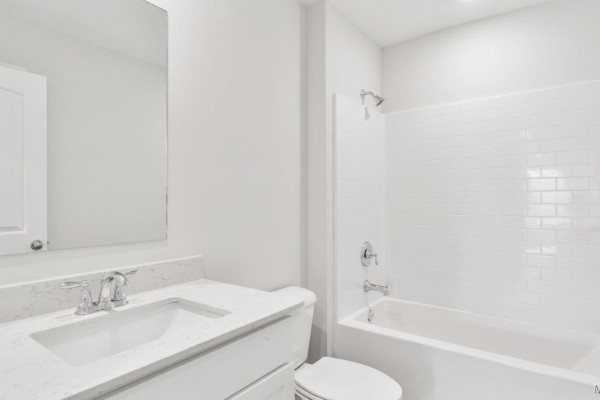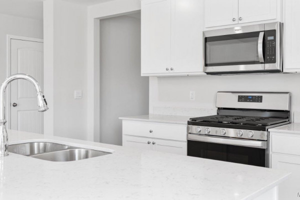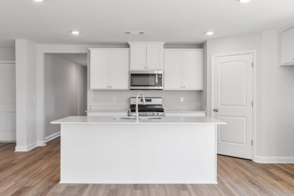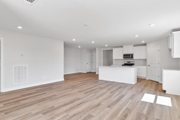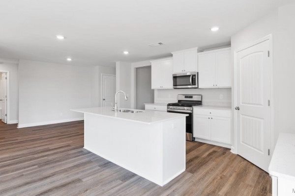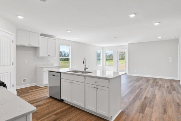 The kitchen boasts a stunning design featuring quartz countertops, a spacious island, stainless-steel appliances and a convenient corner pantry. Seamlessly connected to the family room, this kitchen is ideal for hosting gatherings and enjoying quality time with loved ones. Adjacent to the kitchen, you’ll find a dining area that’s perfect for those family meals. The home is bathed in abundant natural light, creating a serene and inviting atmosphere. The living area has back door access to a covered porch, further enhancing the relaxing ambiance.