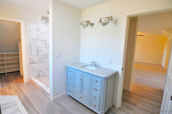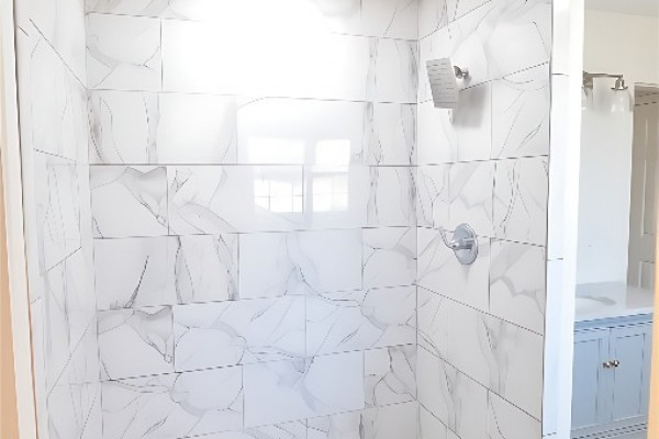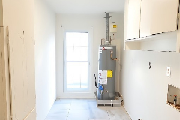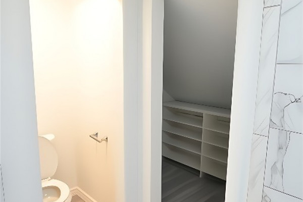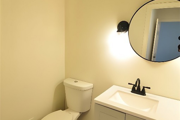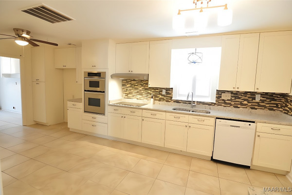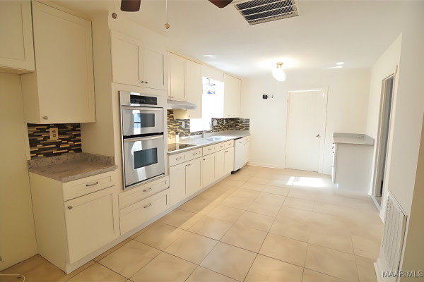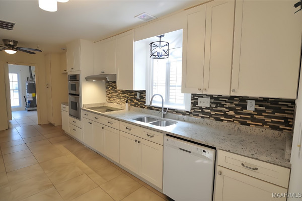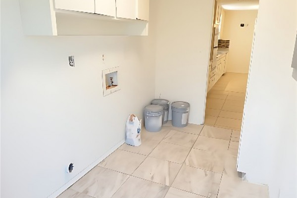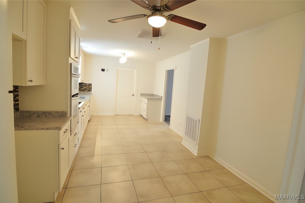 The kitchen offers plenty of cabinet space and modern appliances, making meal prep easy.