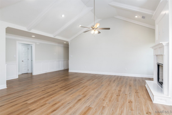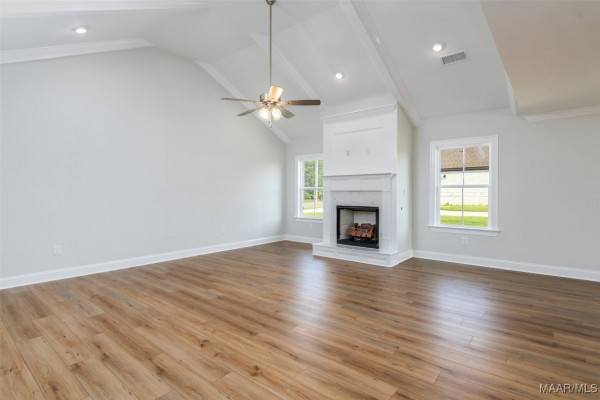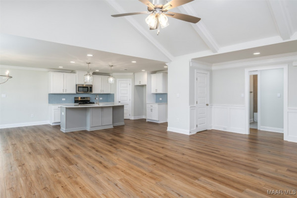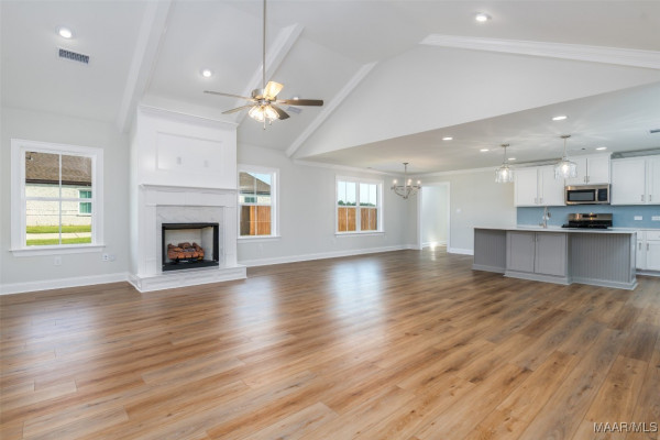 Inside, the “Kinkade” plan combines comfort and style. The great room features a vaulted, beamed ceiling that feels bright and spacious, while the custom fireplace creates a cozy spot to gather on cooler nights.