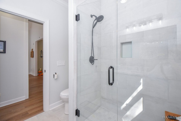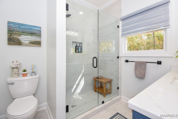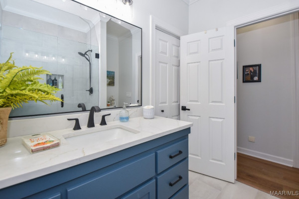 The updated primary bath features a double vanity and a large walk in shower , creating your own private retreat.