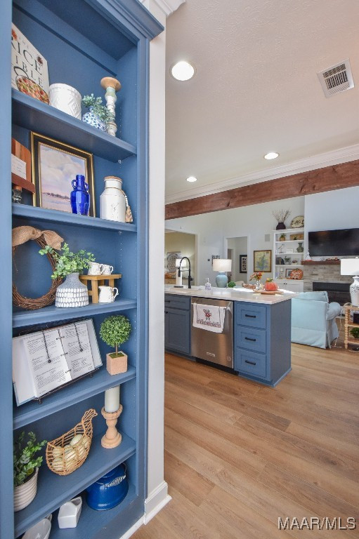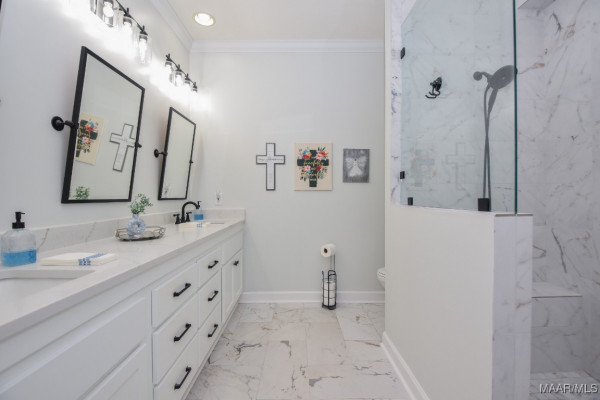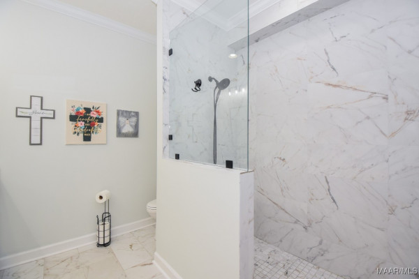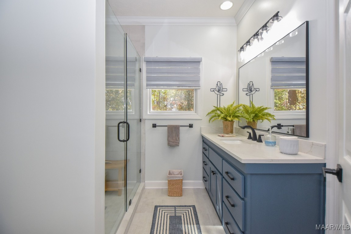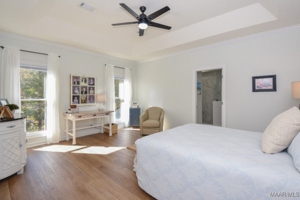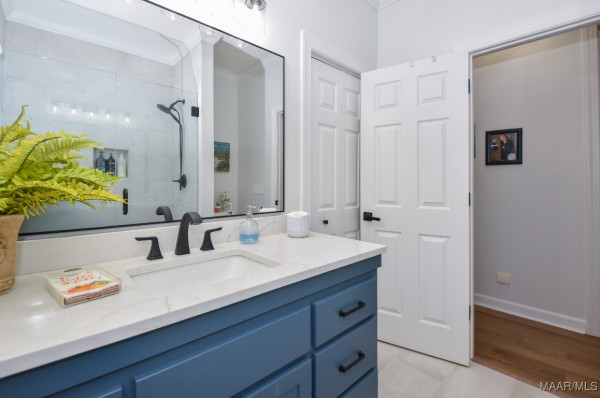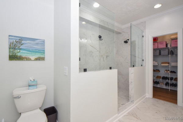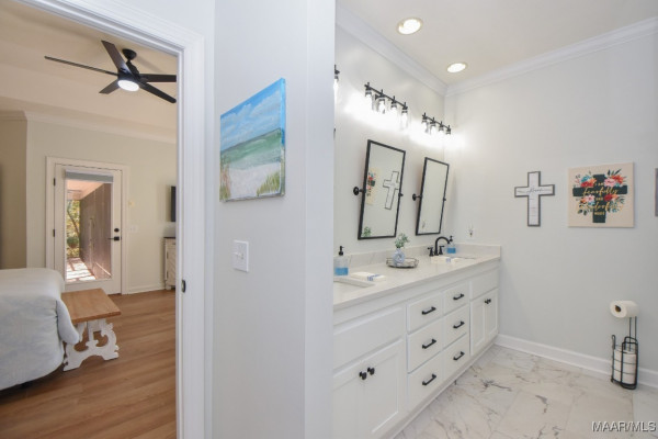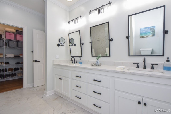 The updated primary bath features a double vanity and a large walk in shower , creating your own private retreat.