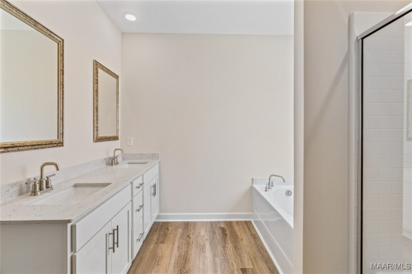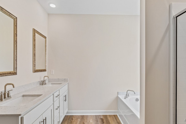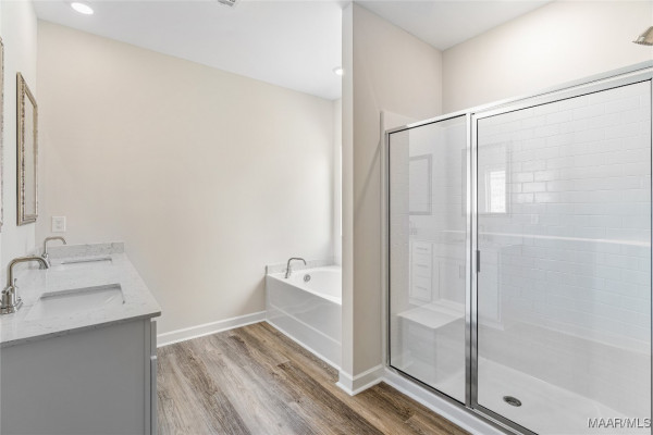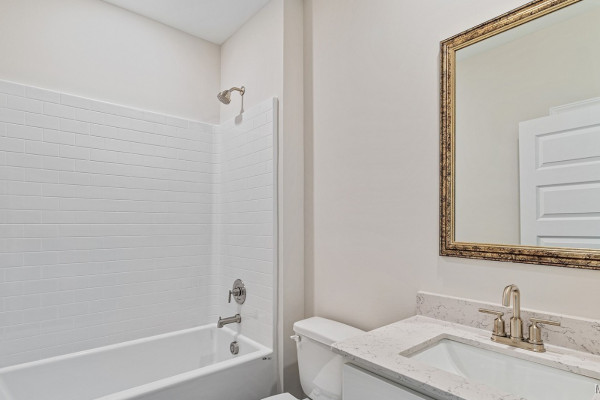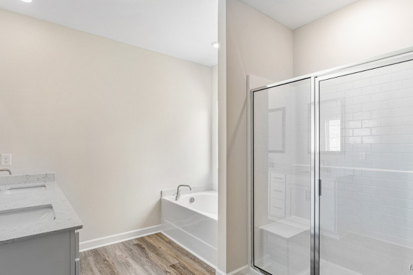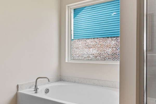The primary bedroom is to the back of the home for privacy. The bedroom has a trey ceiling and large window allowing in natural light. The ensuite has a large walk-in closet, separate water closet, tiled shower and garden tub. The dual sink vanity has a quartz countertop and will allow for that much needed space in the morning.