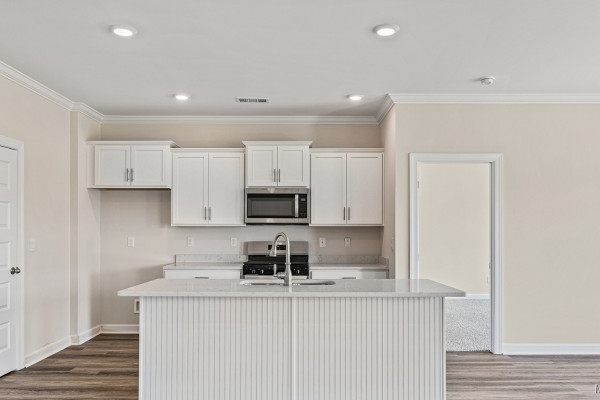 The living room, dining and kitchen is an open design. As you enter the great room you are met with the heart of the home, the kitchen. This light design offers white shaker-style cabinetry, quartz countertops and stainless-steel appliances. The dining room is open off the kitchen and looks out to the backyard and covered porch.