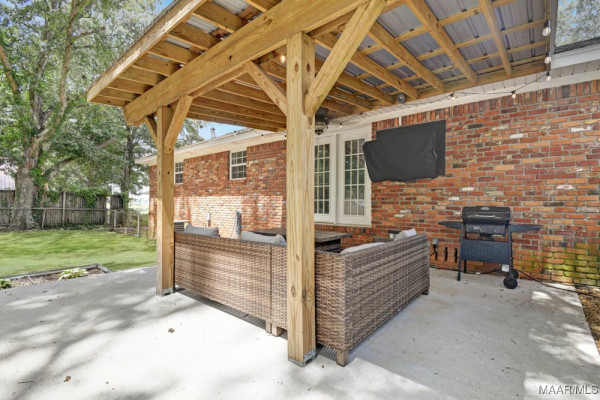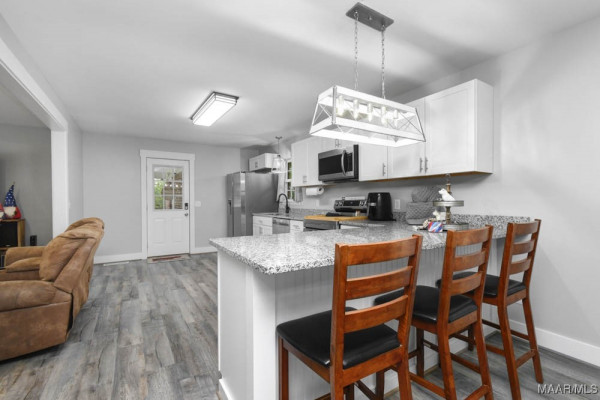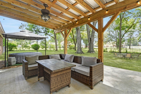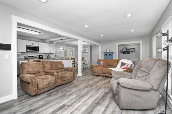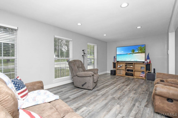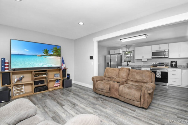 The large kitchen, with stainless steel appliances, lots of cabinets for storage and a large breakfast bar, grants to plenty of space to prepare for these gathering. The open concept allows interaction with those who prefer the indoor seating in the large living room.