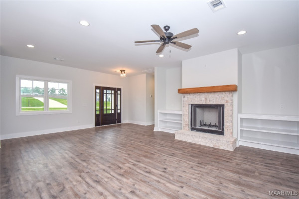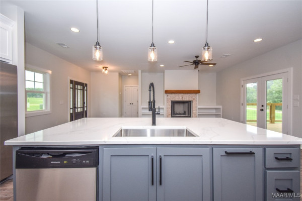 This beautifully designed home is a must-see! Featuring a desirable split floor plan, it offers a spacious open-concept den and kitchen with a large island sink, perfect for both everyday living and entertaining. The inviting brick fireplace is flanked by custom open shelving, adding warmth and charm to the living area.