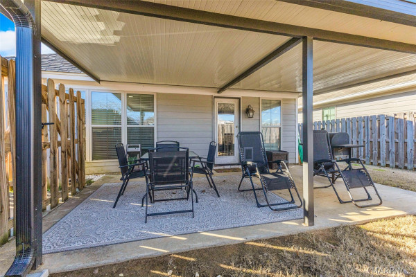 The primary suite includes dual vanities and a large walk-in shower with a built-in bench, offering comfort and long-term functionality. Outside, enjoy a covered patio, a small fenced yard, and a detached storage shed; perfect for relaxed, easy outdoor living.