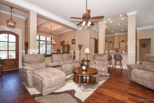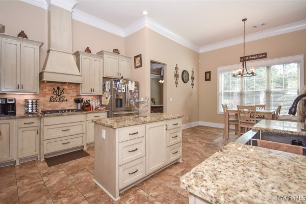 The open-concept kitchen is a chef’s dream, featuring a large island, granite countertops, pantry ,under-cabinet lighting, stainless steel appliances, and recessed lighting.