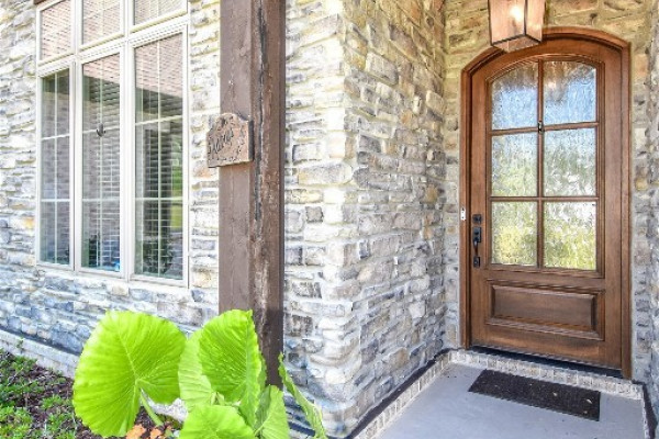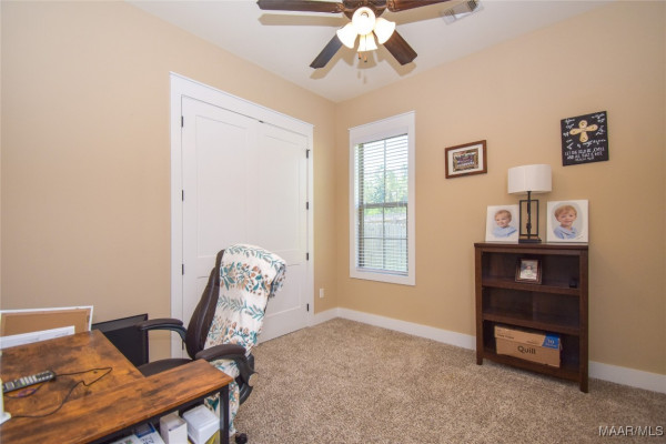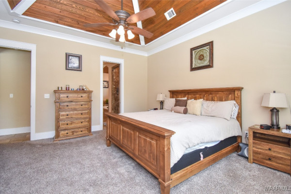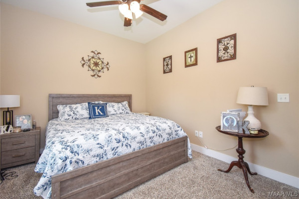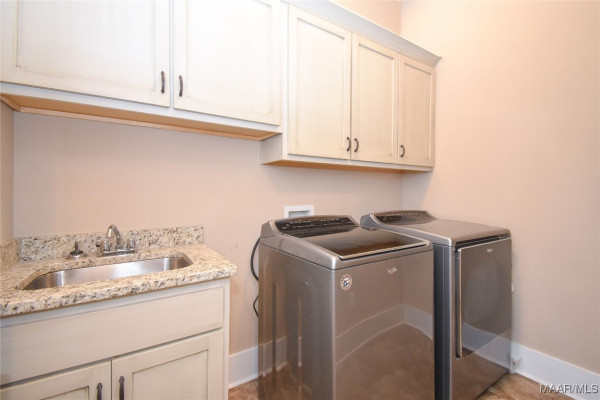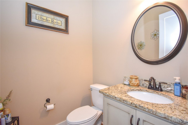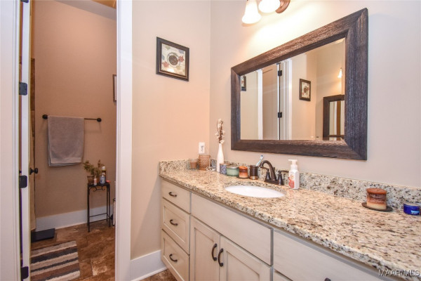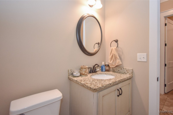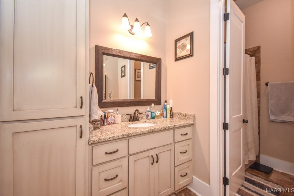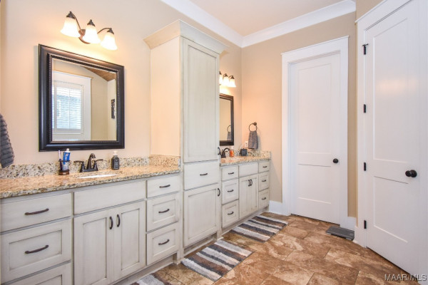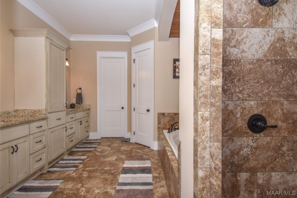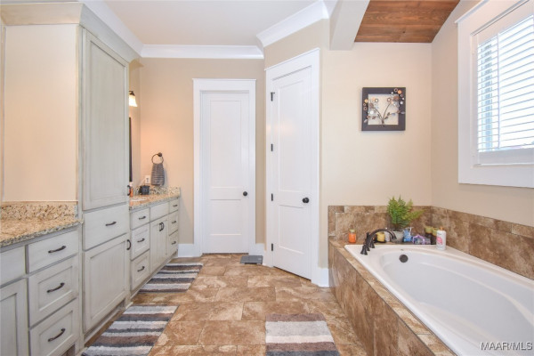 The luxurious main suite offers two spacious walk-in closets and a spa-like bathroom with dual vanities topped with granite, a garden tub, custom-tiled shower, and convenient linen storage.