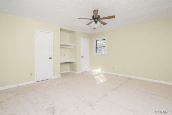 The spacious primary bedroom features a built-in vanity and custom overhead cabinetry for a television. The laundry room is generously sized, offering excellent functionality.