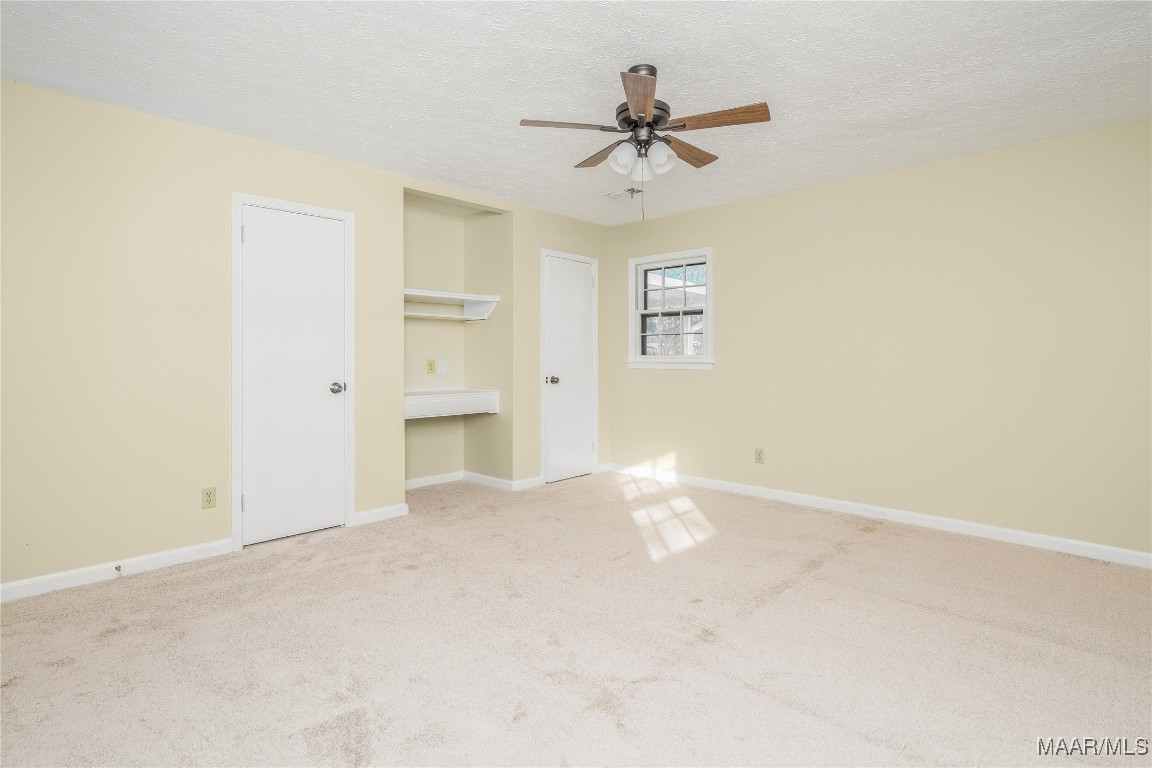 The spacious primary bedroom features a built-in vanity and custom overhead cabinetry for a television. The laundry room is generously sized, offering excellent functionality.