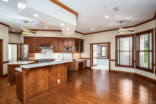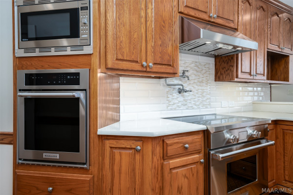 The remodeled kitchen is a chef’s dream, featuring a stainless Wolf stove with induction 5-eye cooktop, Zephyr 6-level hood, Sub-Zero refrigerator, pot filler, two ovens (Wolf + KitchenAid), under-cabinet lighting, and an icemaker. A lovely bay window overlooks the pool area, adding charm to the breakfast space. Storage is abundant with a large custom pantry and a laundry room outfitted with cabinetry and sink.