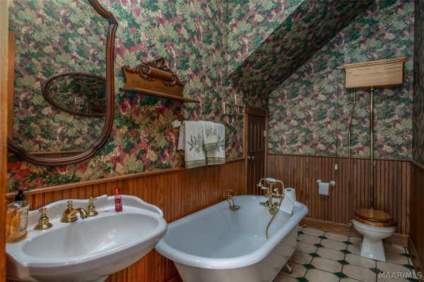The main living area features a dramatic floor-to-ceiling custom oak fireplace mantle and a wood-burning fireplace. For entertaining, the home includes a dedicated entertainment closet and a built-in bar with sink and glass shelving. The primary suite is a luxurious retreat, complete with dual walk-in closets and a serene sitting nook inside the turret, framed by a 12-foot ceiling and leaded glass window bordered in mahogany. The primary bath features a slipper tub, dual sinks, and a spacious shower with both spray and rainfall heads.