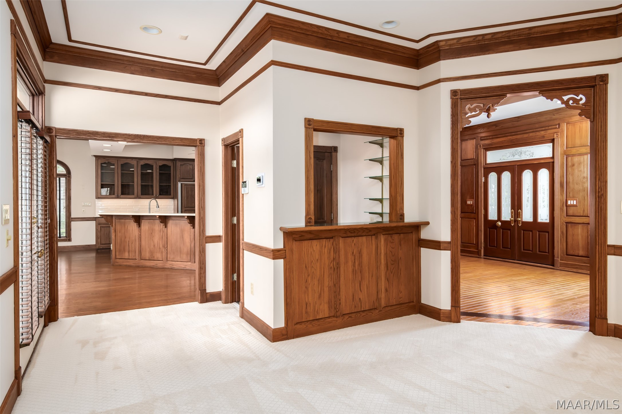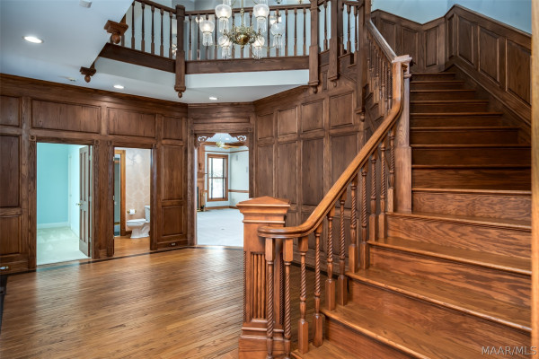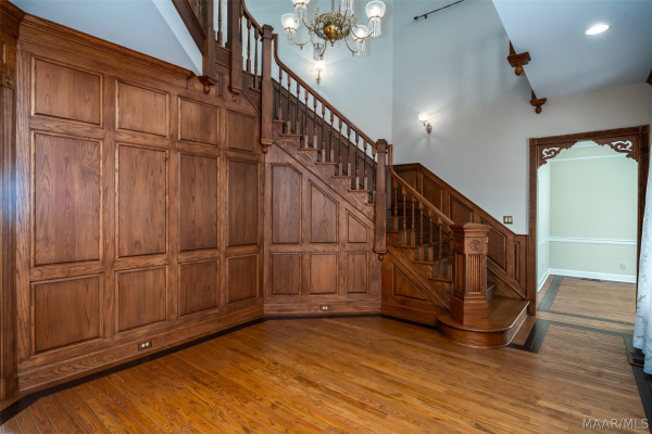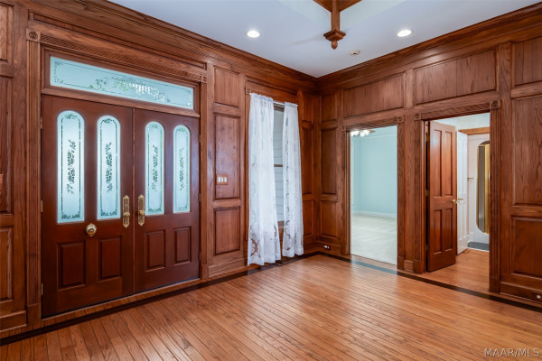 Newly refinished mahogany double front doors with frosted glass set the tone for the remarkable interiors. Step into a grand two-story foyer, framed by oak floating-panel wainscoting, grooved oak floors accented in mahogany, and a custom replica Victorian chandelier. Ten-foot ceilings continue throughout the home, creating a sense of openness and elegance in every room.