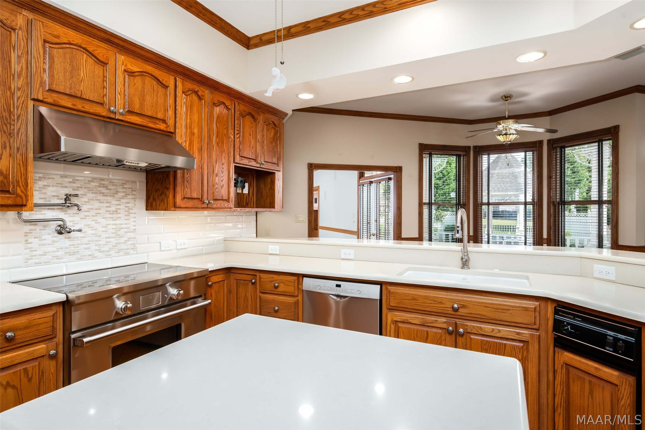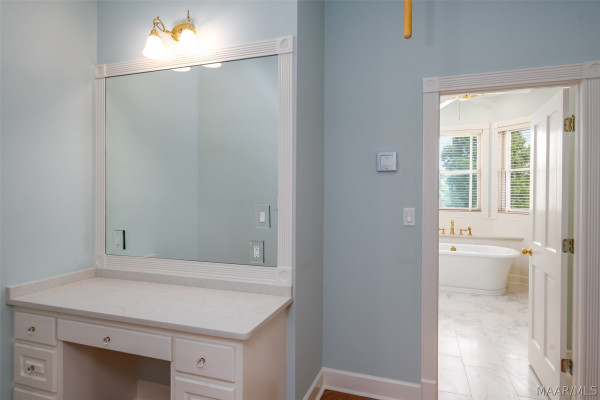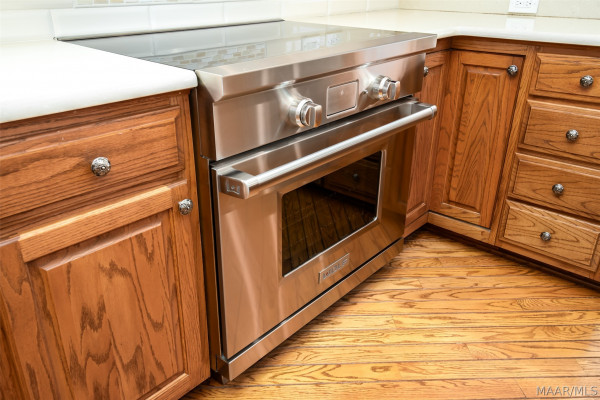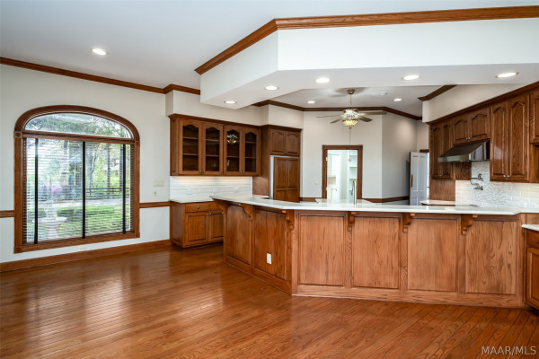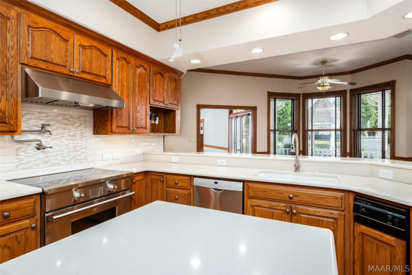 The remodeled kitchen is a chef’s dream, featuring a stainless Wolf stove with induction 5-eye cooktop, Zephyr 6-level hood, Sub-Zero refrigerator, pot filler, two ovens (Wolf + KitchenAid), under-cabinet lighting, and an icemaker. A lovely bay window overlooks the pool area, adding charm to the breakfast space. Storage is abundant with a large custom pantry and a laundry room outfitted with cabinetry and sink.