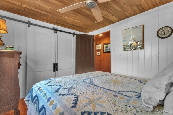 Custom barn doors add distinctive style throughout the cabin, enhancing the home’s unique personality. The large primary bedroom includes a generous walk-in closet, providing ample storage space. Every room has been carefully customized to maximize comfort and functionality.