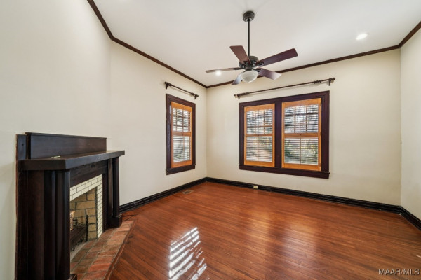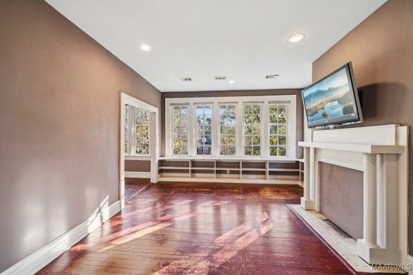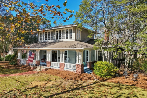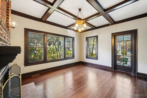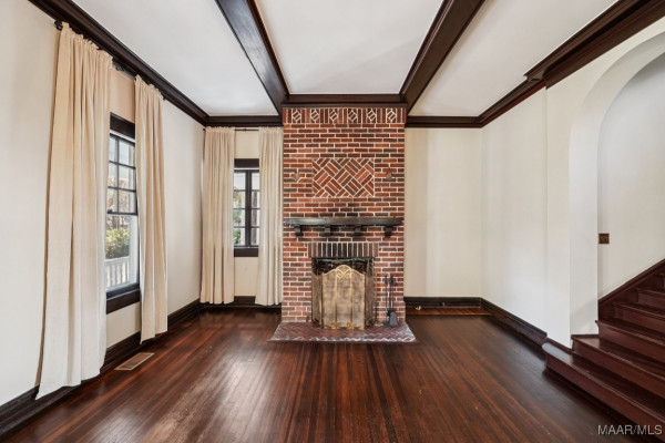 A sweeping wraparound porch, supported by wide brick piers and original heart-pine siding, sets a striking first impression. Inside, Skyview showcases masterful craftsmanship: coffered ceilings, tapestry-brick fireplaces, heart-pine millwork, and extensive original casement and double-hung windows that illuminate the interior. The expansive living room and formal dining room offer refined entertaining spaces, complemented by a bright sunroom and functional service porch.