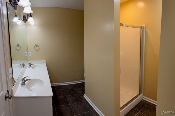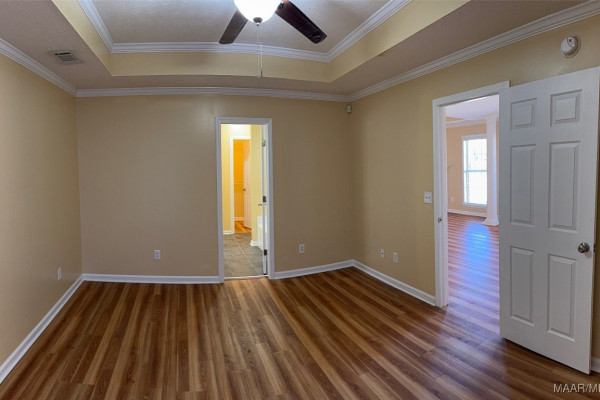 The primary suite includes Box ceilings, dual sinks with extended counter space, a separate walk-in shower, and a large walk-in closet. Bedrooms two and three are both well-sized and share easy access to the second full bath.