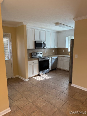 The kitchen is equipped with stainless steel appliances, ample cabinetry, and generous counter space, along with a separate breakfast area. A large laundry room provides additional storage and convenience.