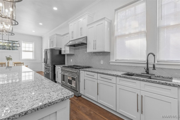Step inside to a welcoming foyer that leads into a large open-concept living area, including a cozy fireplace, formal dining space, and a modern kitchen with granite countertops and brand-new stainless steel appliances—plus a new refrigerator, washer, and dryer. A main-level bedroom and a flexible office or sitting room add to the home’s versatile layout.