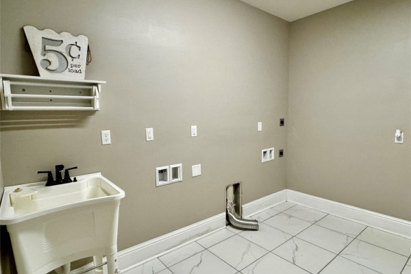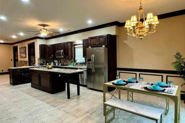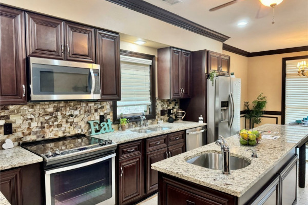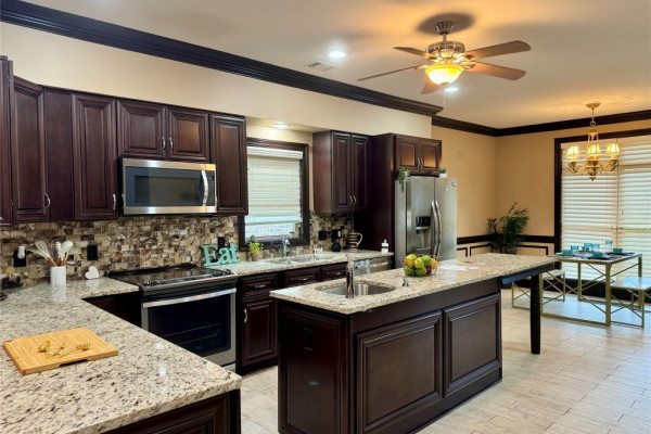 The kitchen is designed to impress, featuring a large island with sink, convection oven, smooth-top range, and a smudge-proof stainless steel refrigerator—ideal for entertaining or everyday living. An oversized laundry room adds even more functionality with a utility sink and hookups for two washers and two dryers.