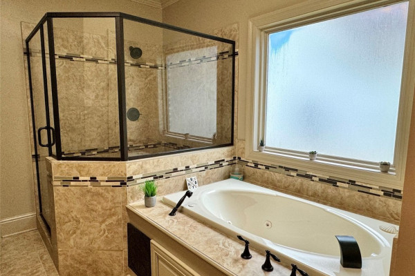 The open, inviting layout is highlighted by stylish wood-plank tile flooring in the main living areas, complemented by cozy carpeted bedrooms. The spacious primary suite is a true retreat, showcasing double vanities, a luxurious jetted soaking tub, an oversized walk-in shower, and an impressive walk-in closet designed for both comfort and convenience.