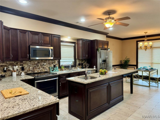The kitchen is designed to impress, featuring a large island with sink, convection oven, smooth-top range, and a smudge-proof stainless steel refrigerator—ideal for entertaining or everyday living. An oversized laundry room adds even more functionality with a utility sink and hookups for two washers and two dryers.