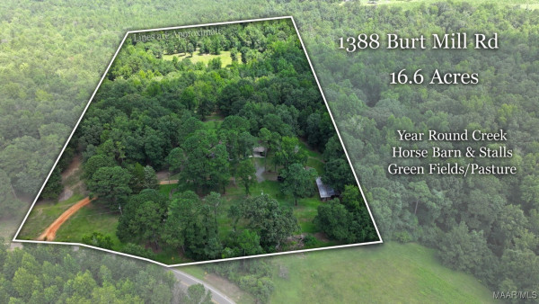 Located just a mile from town off Burt Mill Road in Tallassee, this charming one-level 4-bedroom, 2.5-bath home sits on 16.5 acres of gently rolling land with a creek running through it. Built in the 1980s, the home offers 1,756 sq ft of well-planned space with no wasted square footage. Plus, a bright sunroom that’s separately heated and cooled, a split-bedroom layout with two guest rooms sharing a Jack-and-Jill bath, a third bedroom with its own half bath, and a spacious owner’s suite. The property includes a double carport with an attached wired workshop, plus a powered and watered 6-stall barn with a tack room—perfect for horses or hobbies. Both the house and barn have metal roofs, and the HVAC system is less than a year old. Outside, enjoy the beauty of a giant fig tree and thriving muscadine vines. With privacy, functionality, and convenience just minutes from shopping and only 20 minutes to Lake Martin, this is the ideal place to call home.