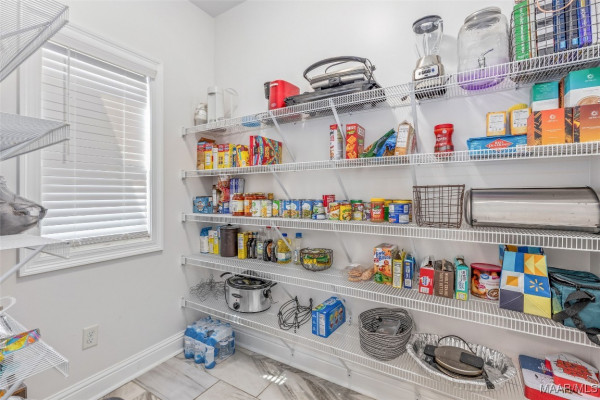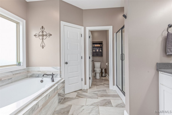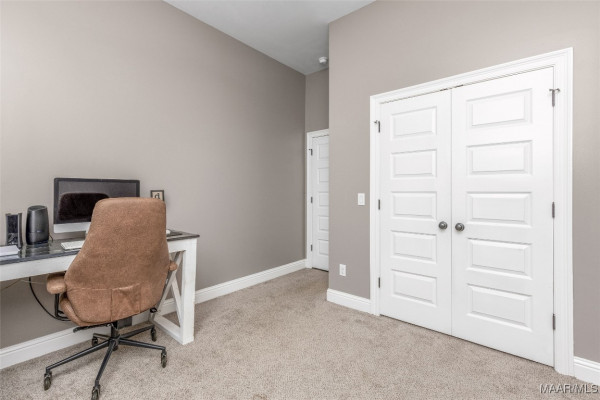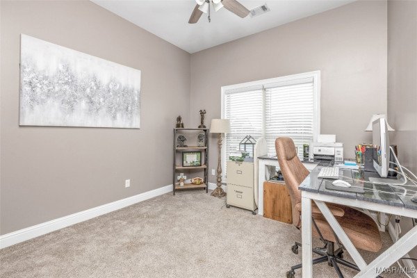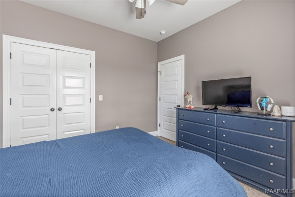 This split floor plan offers privacy with the primary suite on one side & 3 guest bedrooms on the other. The primary suite easily accommodates a king set & features a spa-like bath with a garden tub, double quartz vanity & separate shower. The guest wing includes 3 generously sized bedrooms & a full bath with a large vanity & tub/shower combo.