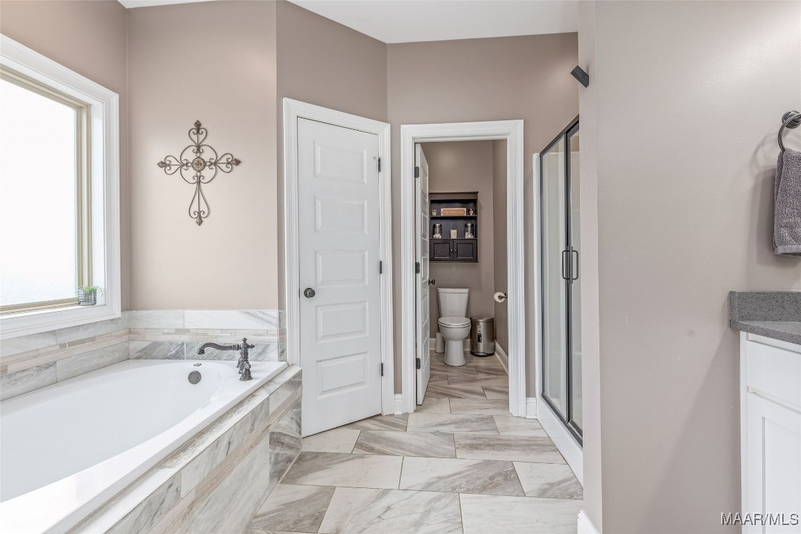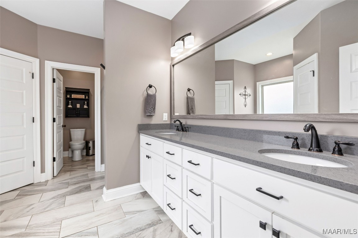 This split floor plan offers privacy with the primary suite on one side & 3 guest bedrooms on the other. The primary suite easily accommodates a king set & features a spa-like bath with a garden tub, double quartz vanity & separate shower. The guest wing includes 3 generously sized bedrooms & a full bath with a large vanity & tub/shower combo.