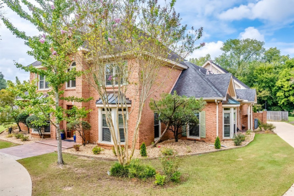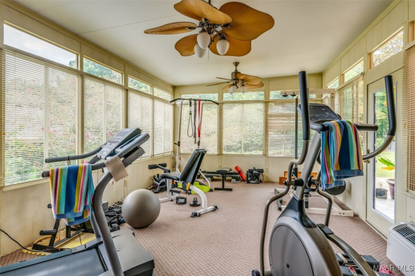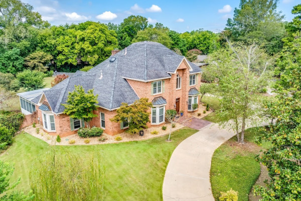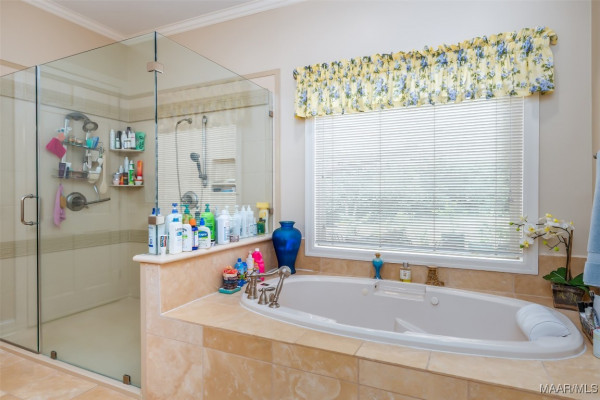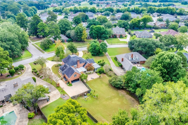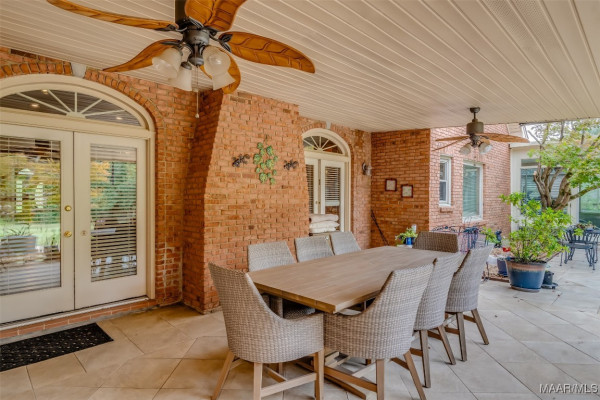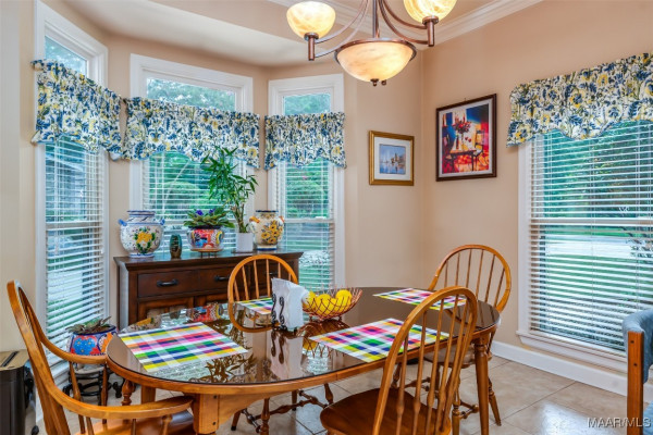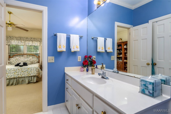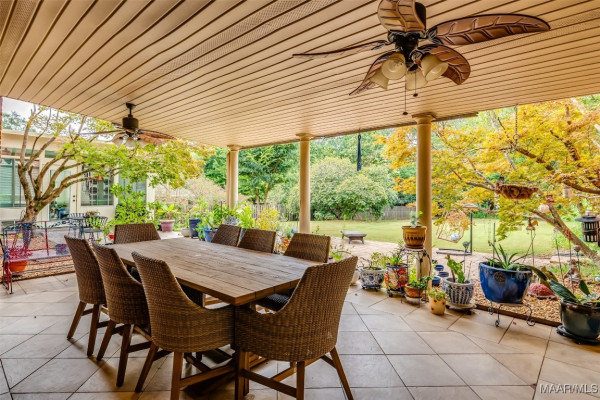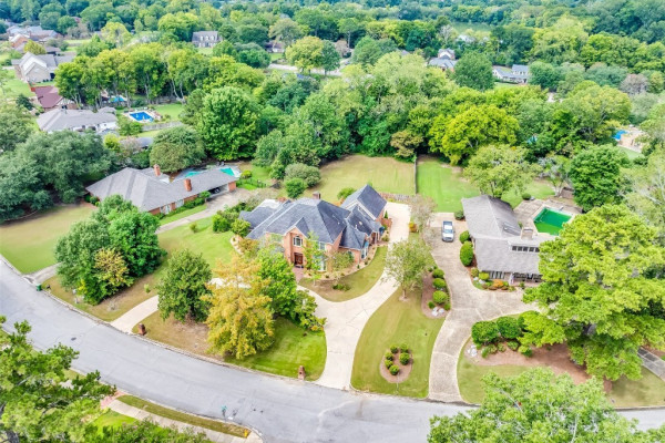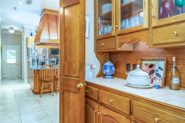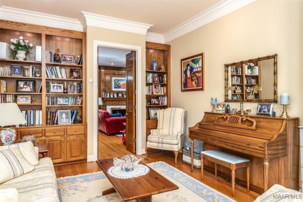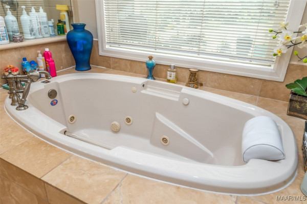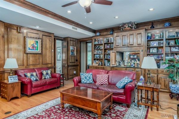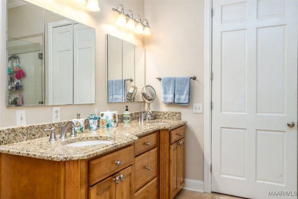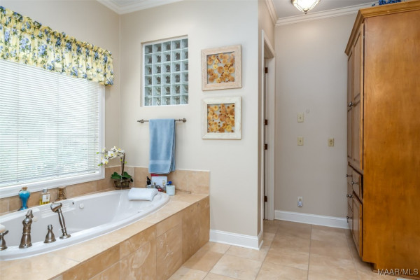The luxurious primary suite features wood floors, a sitting area with built-ins & refrigerator connection, dual closets, & direct access to the sunroom. The spa-like bath includes granite countertops, double vanities, an oversized shower, jetted tub, & linen closet. The sunroom offers year-round enjoyment with heating & cooling, outdoor carpet, and access to the large, covered patio with tiled flooring & an outdoor counter with natural gas connection.