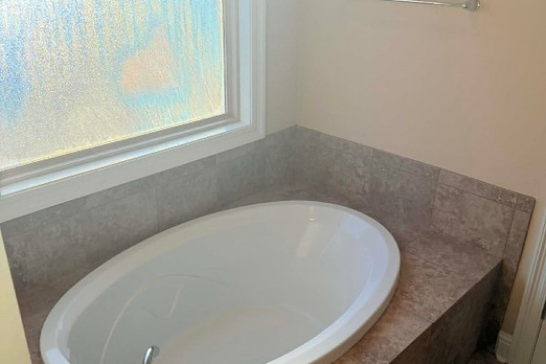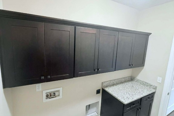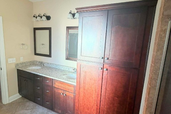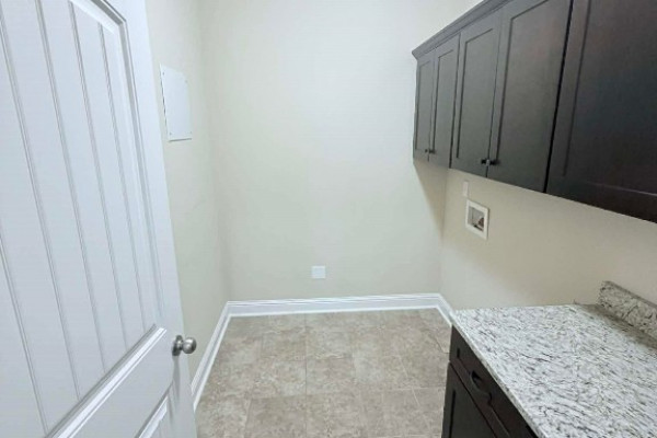 The main-level primary suite includes a double granite vanity, garden tub, fully tiled walk-in shower, private water closet, and walk-in closet. A main-level guest bedroom with an attached full bath provides ideal flexibility for guests or multi-generational living. The downstairs laundry room features granite folding counters and ample storage.