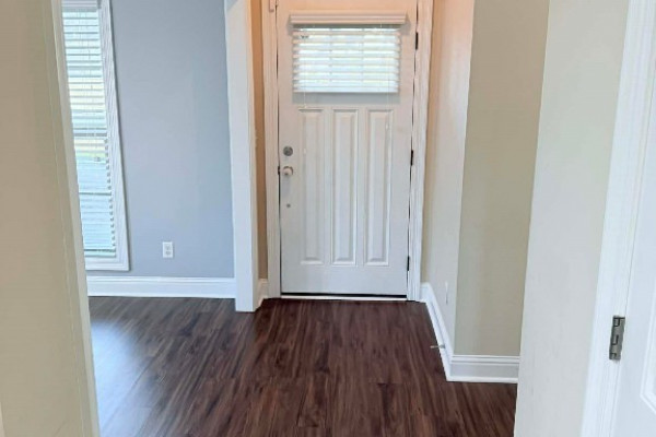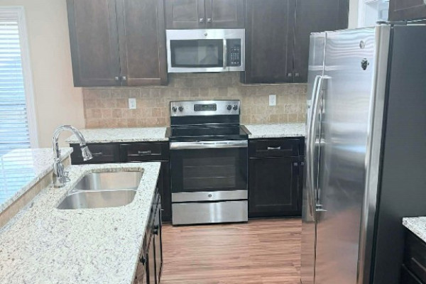 Enjoy instant curb appeal with a large covered front porch, perfect for relaxing evenings. Inside, a welcoming foyer opens to a spacious great room featuring laminate wood flooring and a wood-burning fireplace. The open-concept kitchen offers granite countertops, abundant cabinetry, stainless steel appliances (refrigerator included), tile flooring, and a convenient breakfast bar.