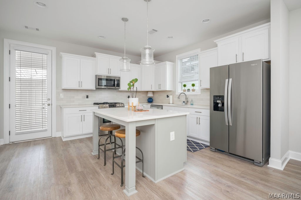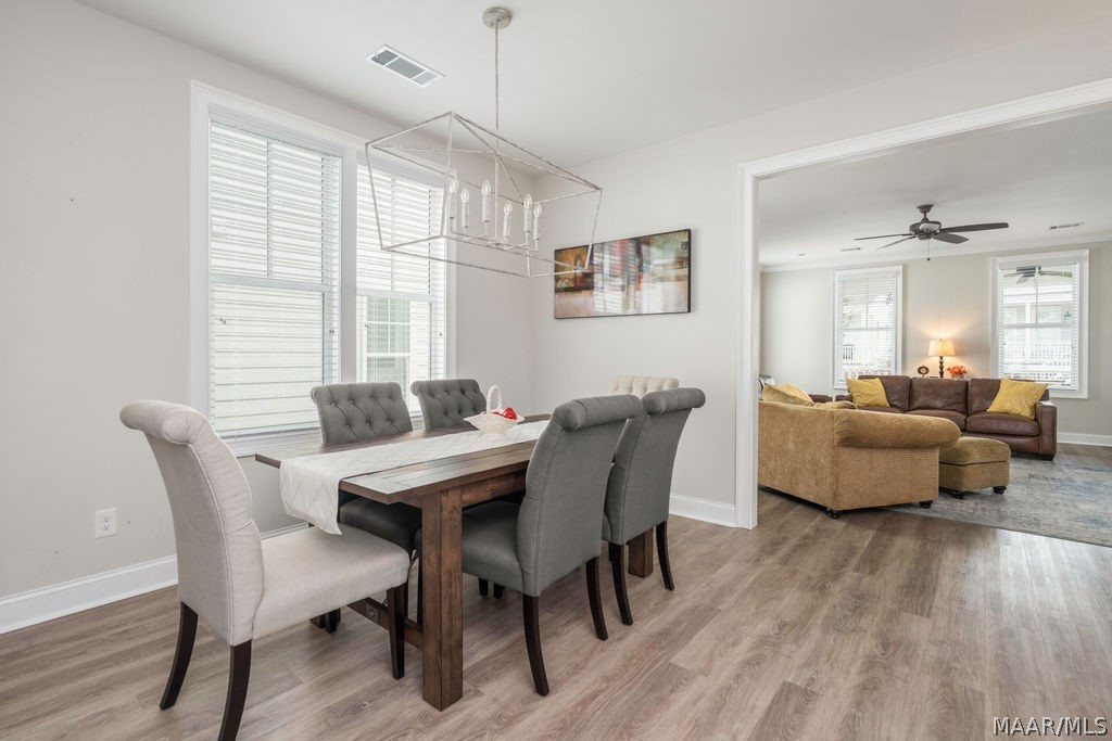 This well-maintained home offers a thoughtful layout with three bedrooms on the main level plus a garage, all just a short walk from the Blue Heron Pool Club. A welcoming front porch leads into the foyer, opening to a bright and spacious kitchen, living, and dining area featuring beautiful hardwood floors. The kitchen is designed for both everyday living and entertaining, with a large work island and bar seating, walk-in pantry, painted cabinetry, and stylish finishes. The dining area is highlighted by custom lighting, adding a warm and inviting touch. The living space offers plenty of room to gather, with easy access to the covered back porch, perfect for relaxing or enjoying time outdoors. The owner’s suite provides a private retreat with an ensuite bath featuring double vanities, a soaking tub, tiled shower, and two walk-in closets. On the opposite side of the home, you’ll find two guest bedrooms and a full bath, offering a functional and private layout. Upstairs, a versatile space with a full bath and closet can serve as a fourth bedroom, bonus room, or home office. Enjoy all that The Waters has to offer, with convenient access to community amenities and the lifestyle that makes this neighborhood so special.