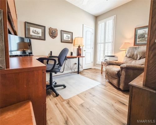 Plantation shutters add a touch of luxury throughout the home. Two generous bedrooms sit on one side of the home, with the main suite on the other, plus a versatile 4th bedroom or office just off the kitchen. The laundry room features matching painted cabinetry and includes the washer and dryer.