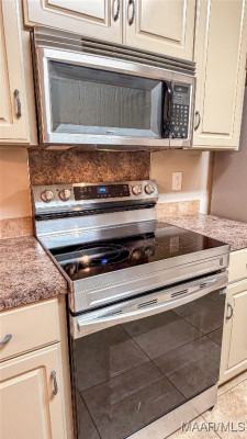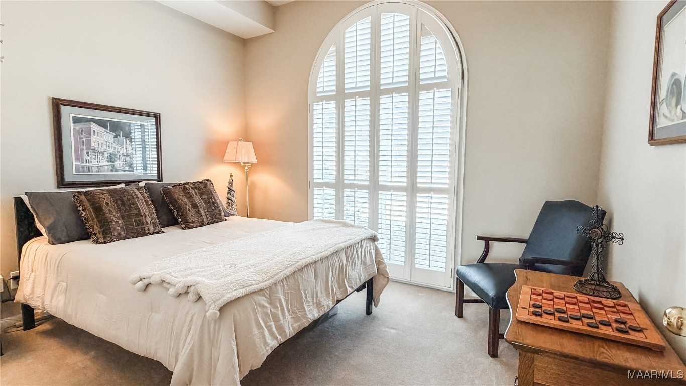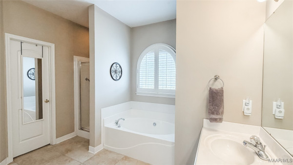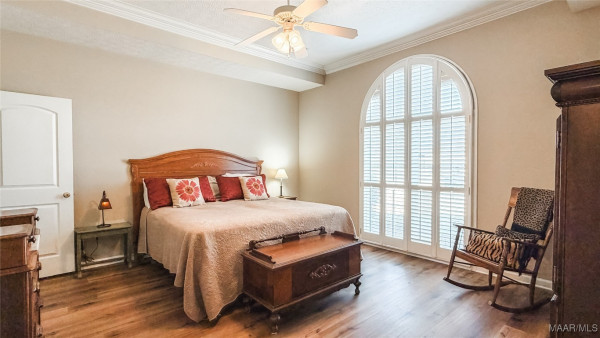 The galley kitchen is well-appointed with updated appliances, including a refrigerator (2019), dishwasher (2022), glass cooktop stove (2024), and built-in microwave. Beautiful wood floors and a striking arched window make the spacious main bedroom feel like a true retreat. The main bath offers a soaking tub, separate shower, double vanities, and a large walk-in closet.