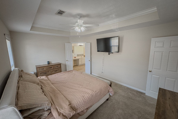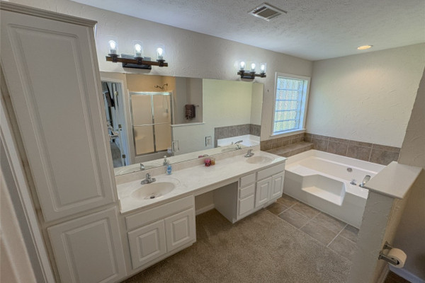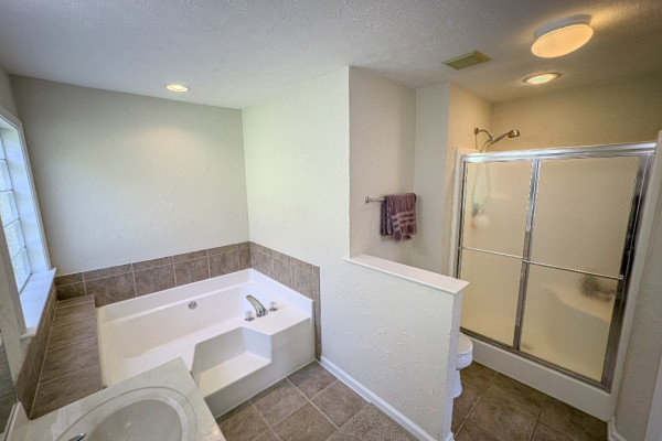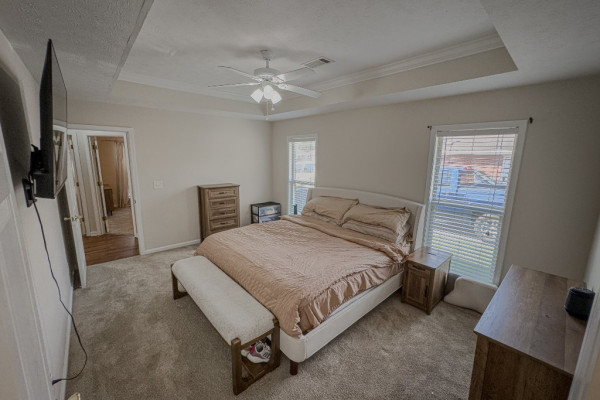 The main bedroom has a tray ceiling, a walk-in closet, and a roomy bath with double vanities, a garden tub, and a separate shower. The two additional bedrooms are a good size and share a full bath.