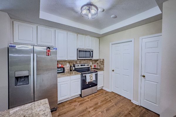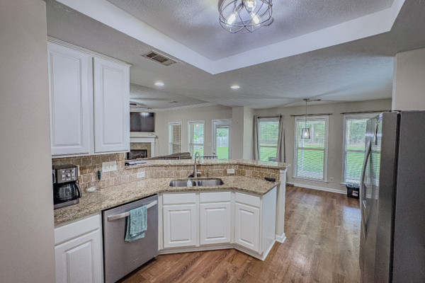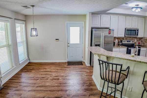 The kitchen has a nice open flow, with a breakfast area that looks out over the backyard through three big windows. Lots of natural light, and a peaceful view you don’t often find. Step outside and you’ve got a large, fully fenced yard that backs up to woods—no rear neighbors—and a covered patio that makes it easy to enjoy the space year-round.