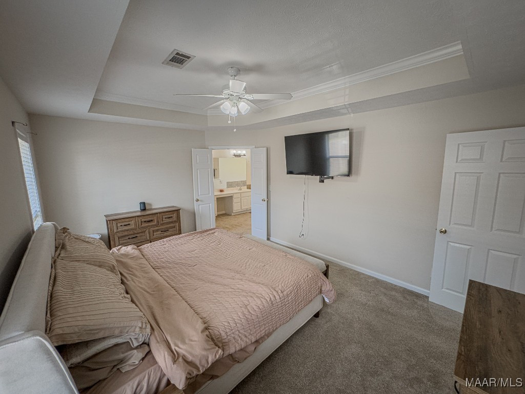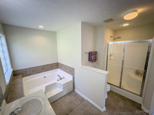The main bedroom has a tray ceiling, a walk-in closet, and a roomy bath with double vanities, a garden tub, and a separate shower. The two additional bedrooms are a good size and share a full bath.