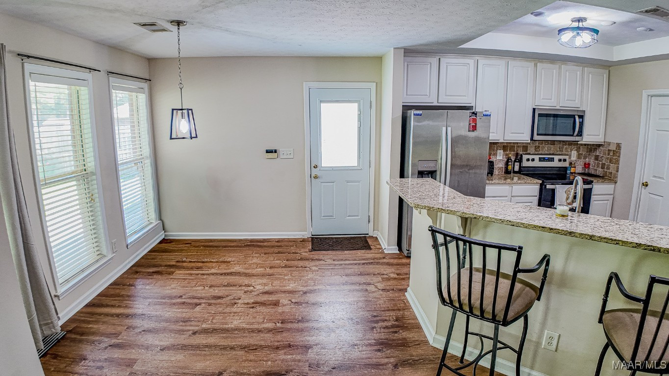 The kitchen has a nice open flow, with a breakfast area that looks out over the backyard through three big windows. Lots of natural light, and a peaceful view you don’t often find. Step outside and you’ve got a large, fully fenced yard that backs up to woods—no rear neighbors—and a covered patio that makes it easy to enjoy the space year-round.