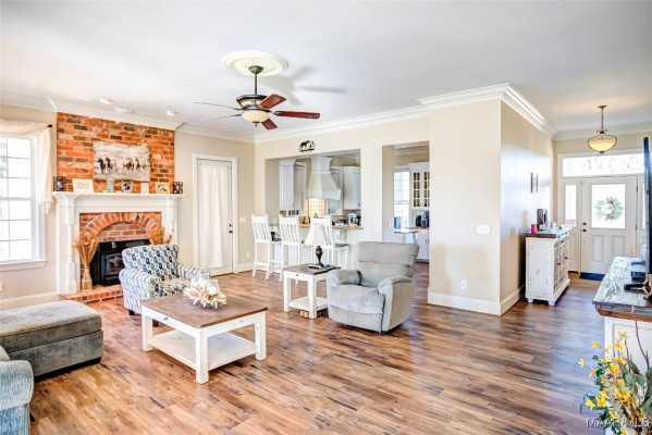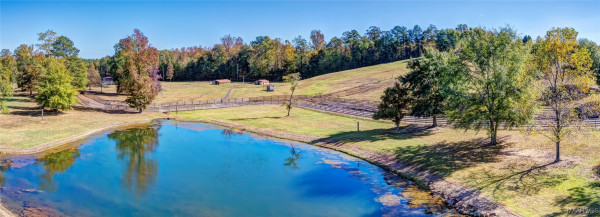Perched atop a hill, the 2,331 sq ft home overlooks the ranch and two scenic ponds with sweeping countryside views. Built in 2006, the home blends Southern charm with modern comfort—tall ceilings, wide windows, and a warm, open layout. It offers 2 spacious bedrooms, 2.5 baths, and an additional room that can serve as a third bedroom or office. A covered front porch and private back patio provide the perfect spots to relax and enjoy the serene setting. The home sits on a poured slab with an attached two-car garage, and it’s connected to county water and fiber optics for modern convenience.