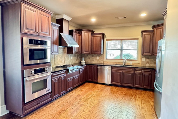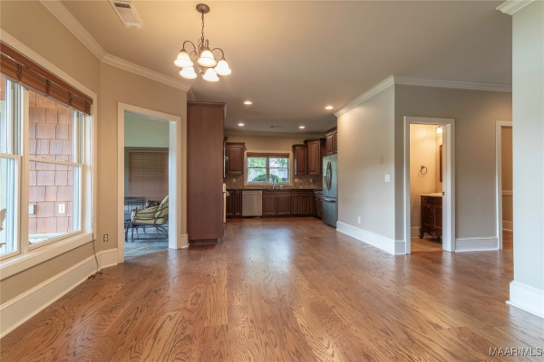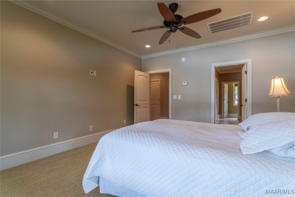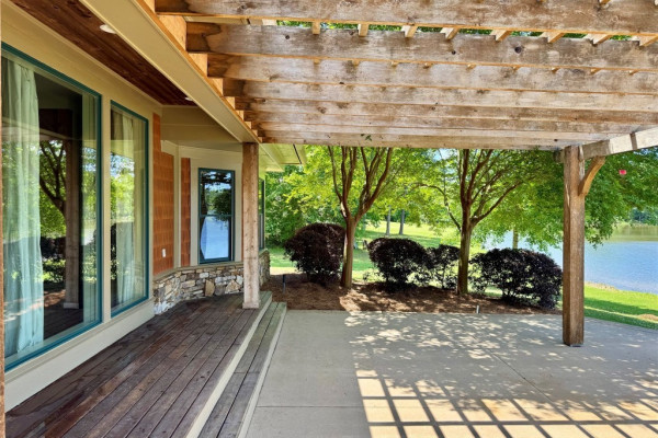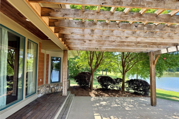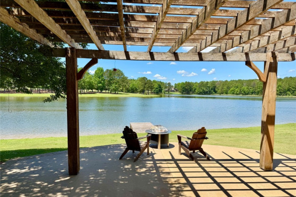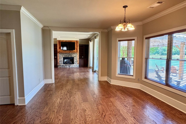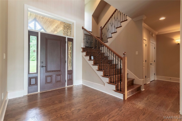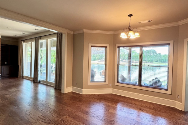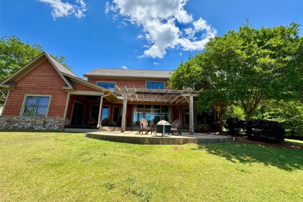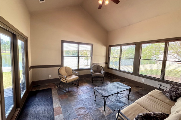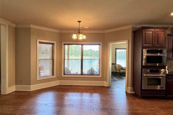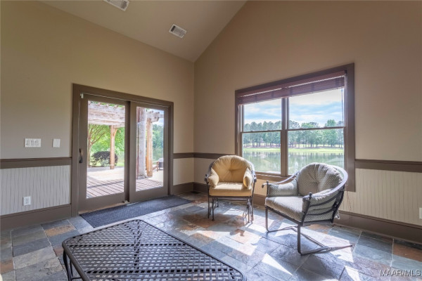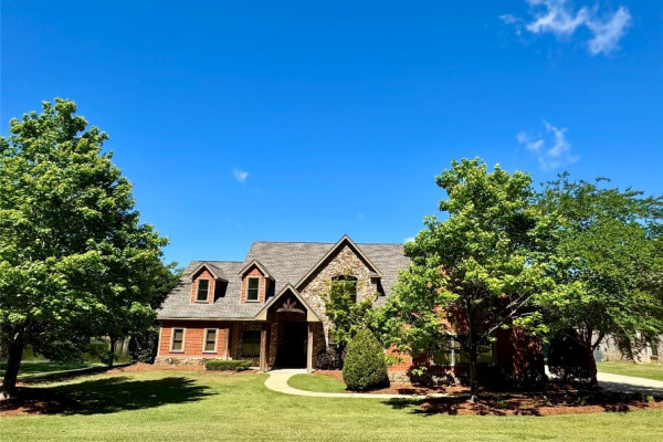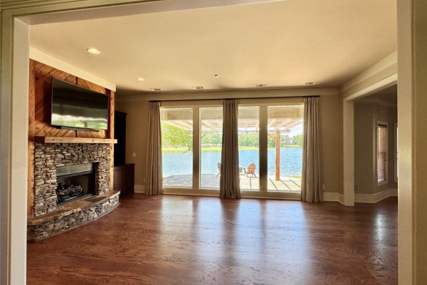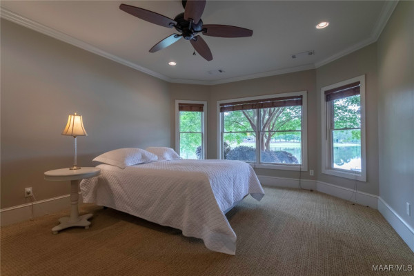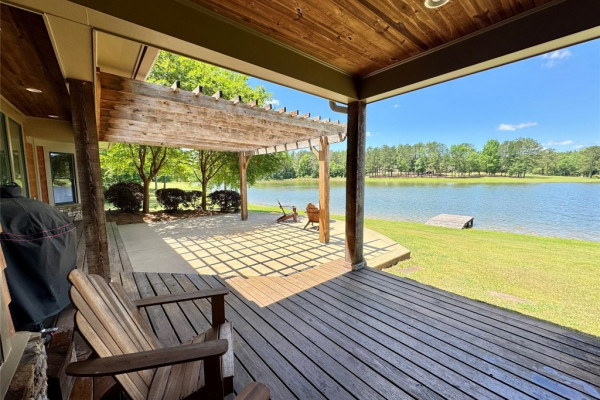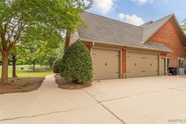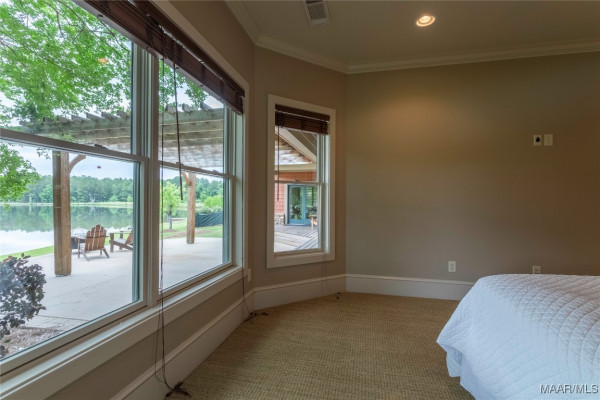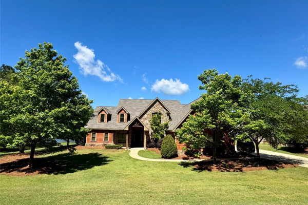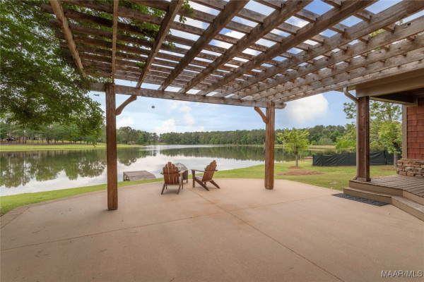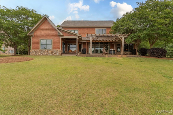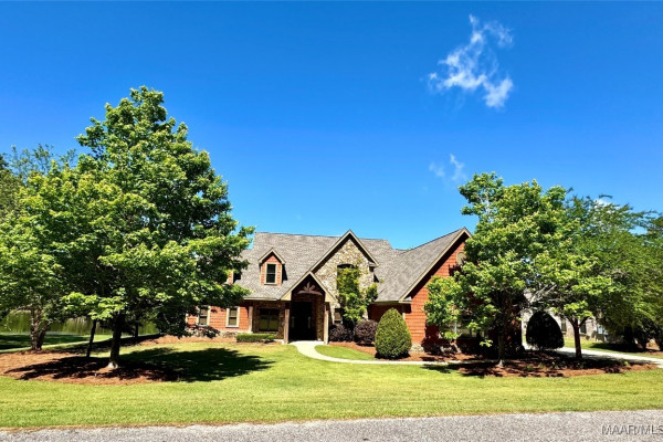 STUNNING lakefront property on a 1.5 acre lot in beautiful Woods N Water! This beautiful stone and shake exterior 3 bedroom, 2 1/2 bath home boasts amazing views of the lake from the minute you walk in. The greatroom features a large stone fireplace with new gas logs, built-in bookcases flanking the fireplace, new wood floors installed in 2025, elevated crown molding/baseboards, and wall of windows for the serene view. The kitchen features custom cabinetry, Jenn-Air appliances, brand new refrigerator and stainless vent hood, granite countertops, and those beautiful new wood floors in the kitchen and dining area. The sunroom is off of the kitchen with vaulted ceiling, slate tiled flooring, and leads to the covered patio. Main bedroom suite downstairs with large bath, double vanity, jetted tub, separate shower and large walk-in closet. You will also find a study/office downstairs, large laundry room, and half bath. Upstairs are two large additional bedrooms and large bath. A HUGE bonus/media room that could be used as a large 4th bedroom. In addition to all this there is additional space that could be finished out that is being utilized as walk-in storage space that spans over the three-car garage. New roof 2024. Just 15 minutes from Montgomery or Pike Road. Pull up your chairs and watch the INCREDIBLE sunsets over the lake in your own backyard!