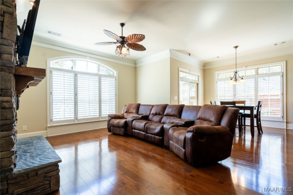 Upon entering through the double, glass-front mahogany doors, you’ll find double French doors leading to the office on the left and an oversized formal dining room to the right. Straight ahead, the expansive great room with its stone fireplace and 20-foot ceilings, providing a grand yet inviting atmosphere.