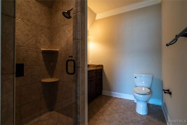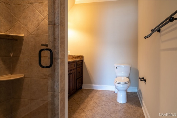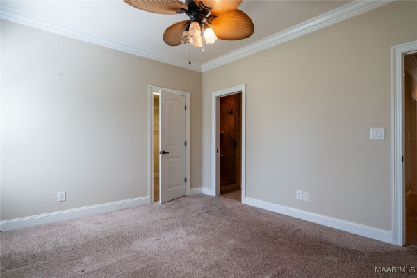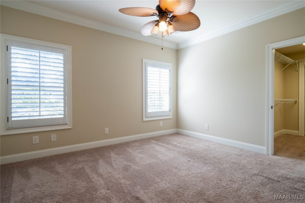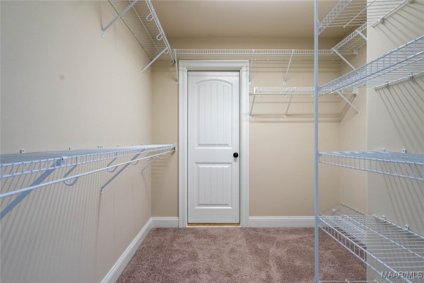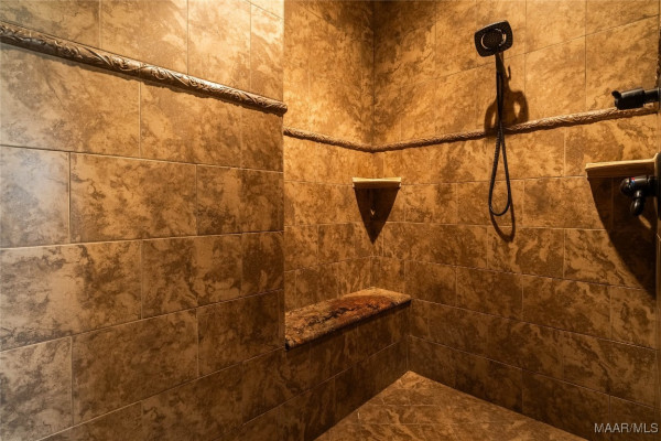 The master suite is a luxurious retreat, complete with a walk-in tile shower with multiple showerheads, a jetted tub, double vanities, and heated tile floors. The master closet doubles as a storm shelter with steel walls, offering built-in shelving and drawers.