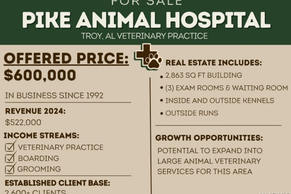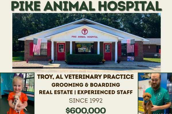 Veterinary practice in Troy, Alabama, in operation for 33 years, includes boarding and grooming services, along with the associated real estate. Wonderful, experienced staff in place and is now offered for sale by the family of Dr. Lawrence Johnston. Pike Animal Hospital boasts a long-standing, highly regarded presence in the Troy community, built on compassionate care for small and large animals. Offered for sale by Dr. Johnston’s family, this practice has earned trust through decades of reliable service, making it a beloved local institution. The acquisition includes the veterinary practice, the well-maintained building, and all essential equipment and furnishings for seamless daily operations. Benefit from a clientele of over 2,600 long-time clients eager to maintain their relationship with the practice. This solid foundation provides opportunities for steady income and organic growth. The hospital features 3 exam rooms, a dedicated surgery suite plus complete office furnishings. Enhance your revenue streams with overnight and long-term boarding in clean, climate-controlled facilities. Grooming services add further value, catering to the full spectrum of pet care needs. Step into an operational business designed for smooth handover. Ideal for an individual veterinarian or expanding group. Situated in a prime market with a growing demand for veterinary services, this operation is poised for expansion. A personable, professional veterinarian can leverage the existing infrastructure to introduce new specialties, extend hours and potentially add large animal services in this welcoming Southern community.